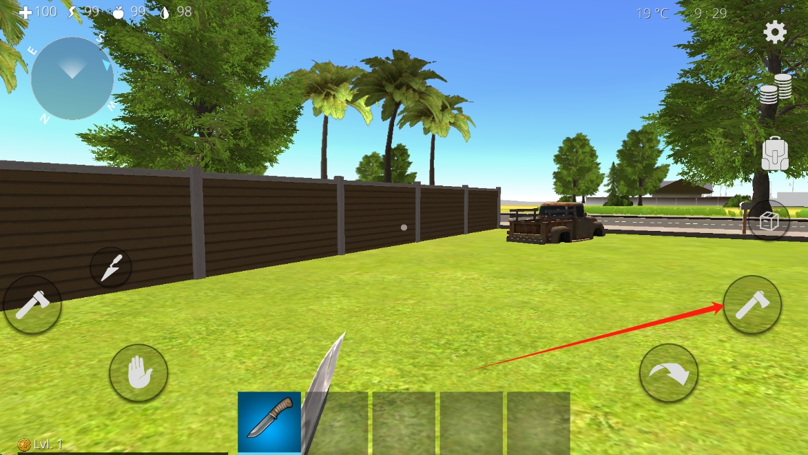 3、點(diǎn)擊右側(cè)錘子圖標(biāo),用工具采集資源,為建造工具、生存發(fā)展做準(zhǔn)備,點(diǎn)擊攻擊敵人。