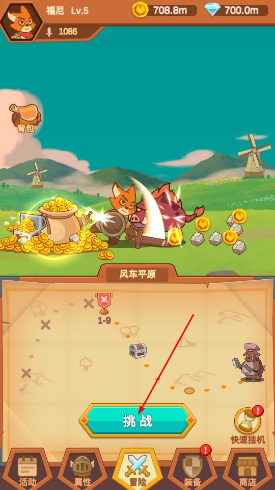 1、在冒險(xiǎn)界面點(diǎn)擊挑戰(zhàn)按鈕進(jìn)入風(fēng)車平原關(guān)卡如1-9,角色福尼Lv.5開啟戰(zhàn)斗,界面顯示金幣、鉆石及戰(zhàn)力數(shù)值。