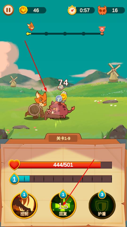 2、戰(zhàn)斗中操控福尼攻擊野豬等怪物,留意上方計(jì)時0:57等與剩余怪物數(shù)16等,觀察血量條444/501等,把控戰(zhàn)斗節(jié)奏。