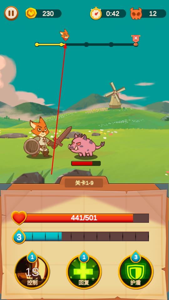 3、合理釋放技能,控制技能限制敵人,回復(fù)技能恢復(fù)血量,護(hù)盾技能增強(qiáng)防御,借技能組合擊敗怪物,查看關(guān)卡進(jìn)程。