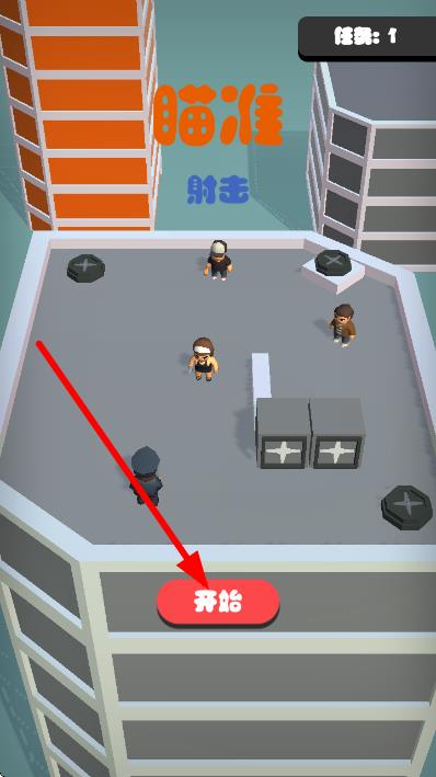 1、進(jìn)入游戲界面,看到任務(wù)1,點(diǎn)擊建筑上的紅色開始的按鈕,啟動(dòng)關(guān)卡,準(zhǔn)備執(zhí)行射擊任務(wù)。