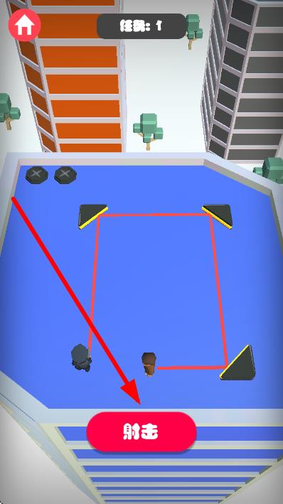 3、確認(rèn)光線經(jīng)反射道具形成閉合路徑后,點(diǎn)擊下方射擊按鈕,發(fā)射子彈,利用反射擊中目標(biāo)完成任務(wù)。