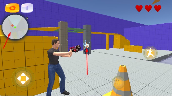 2、在關(guān)卡場(chǎng)景中,依據(jù)提示,通過(guò)左下角虛擬搖桿控制角色移動(dòng),前往箭頭指向位置尋找掩體躲避。