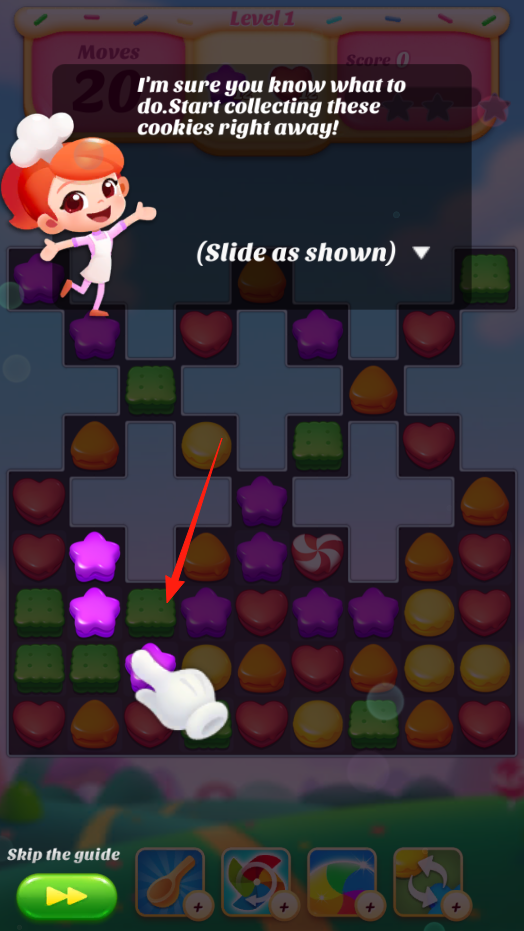 1、進(jìn)入第1關(guān),按提示滑動(dòng)紫色餅干,連成L形就能消除,跟著箭頭,把手指按住紫色餅干拖,湊夠L形狀,消除后得分,開始收集餅干之旅。