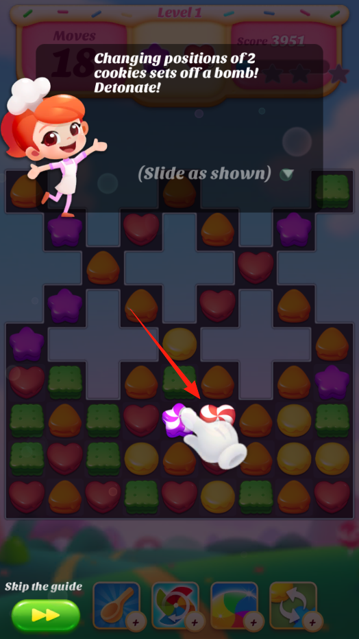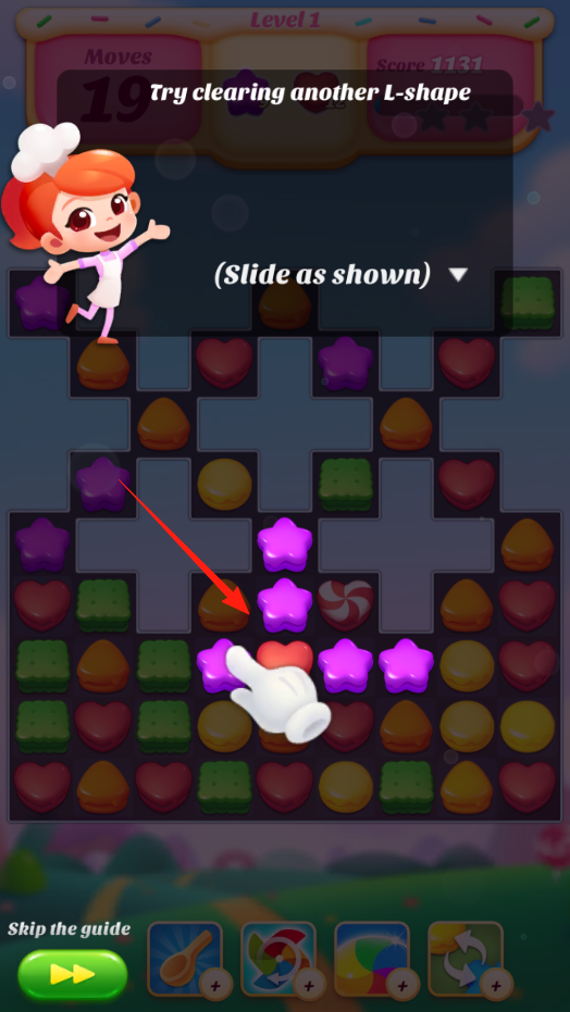 2、繼續(xù)第1關(guān),提示清另一個(gè)L形,看箭頭指的紫色餅干,滑動(dòng)它們排成L形,消除這一組,多湊L形消除,能拿更高分,推進(jìn)關(guān)卡進(jìn)度。