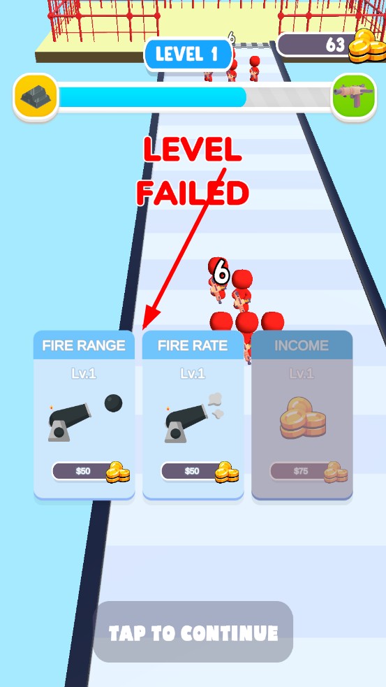 3、若對決失敗,界面顯LEVEL FAILED,進(jìn)入升級界面,消耗金幣強(qiáng)化炮臺射程、射速,逐步提升碾壓實(shí)力。