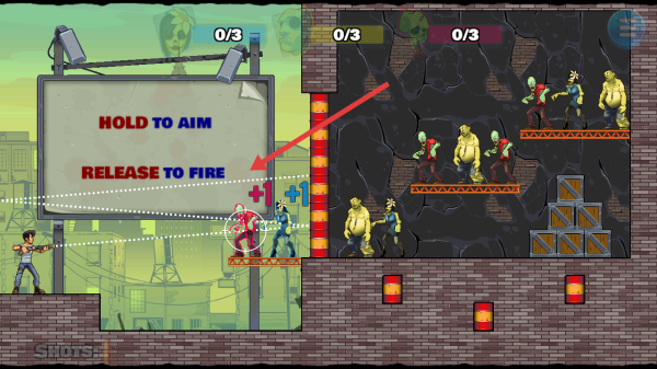 2、戰(zhàn)斗時(shí),長(zhǎng)按屏幕瞄準(zhǔn)HOLD TO AIM,松開RELEASE TO FIRE射擊,優(yōu)先攻擊聚集或高威脅僵尸,注意補(bǔ)充彈藥道具。