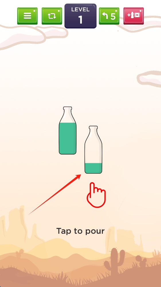 1、關(guān)卡1中,點(diǎn)擊裝有綠色液體的瓶子,將液體倒入另一個(gè)瓶子,完成分裝,點(diǎn)擊裝飲料。
