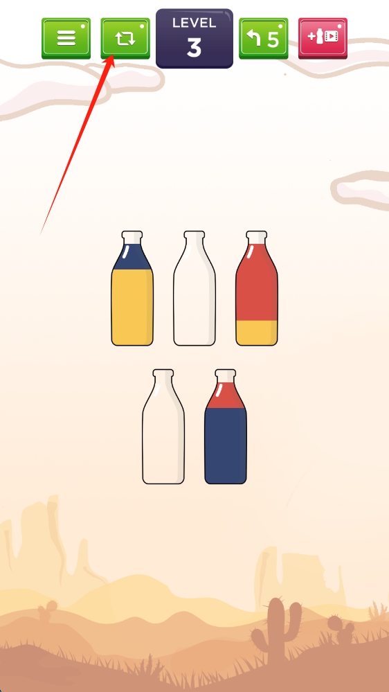 3、關(guān)卡3若操作失誤,點(diǎn)擊上方綠色重置按鈕,重新開始液體分裝,點(diǎn)擊按鈕重開當(dāng)前關(guān)卡。