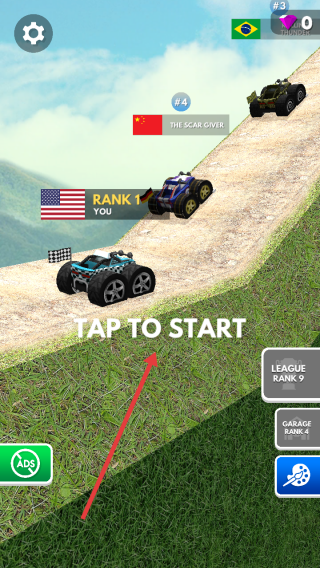1、在越野賽車游戲初始界面,點擊TAP TO START,操控賽車標有RANK1YOU參與Level1比賽。