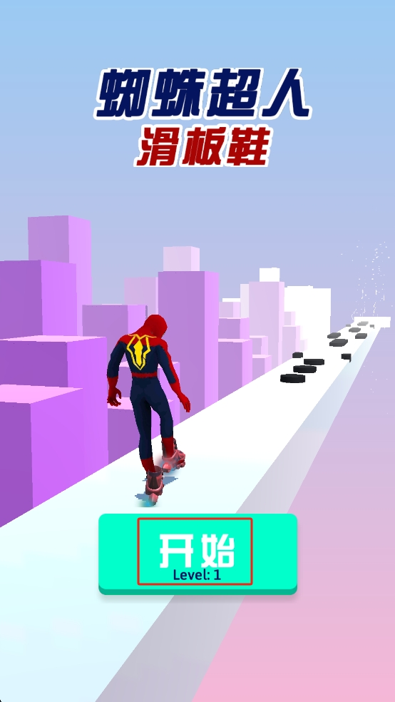 1、這里我們點(diǎn)擊界面中間綠色的開始按鈕,操控身著特殊戰(zhàn)衣的蜘蛛超人,在城市背景的滑板賽道上開啟滑行。
