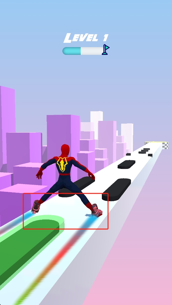 2、滑行過(guò)程中,遇到黑色障礙物時(shí),靈活通過(guò)左右移動(dòng)角色,或是適時(shí)張開雙腿的方式跨越障礙,始終保持在賽道行進(jìn)。