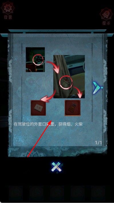 2、在場景中探索,依據(jù)提示如在駕駛位的外套口袋里,獲得煙、火柴,尋找、收集道具,解開機關,推進劇情。