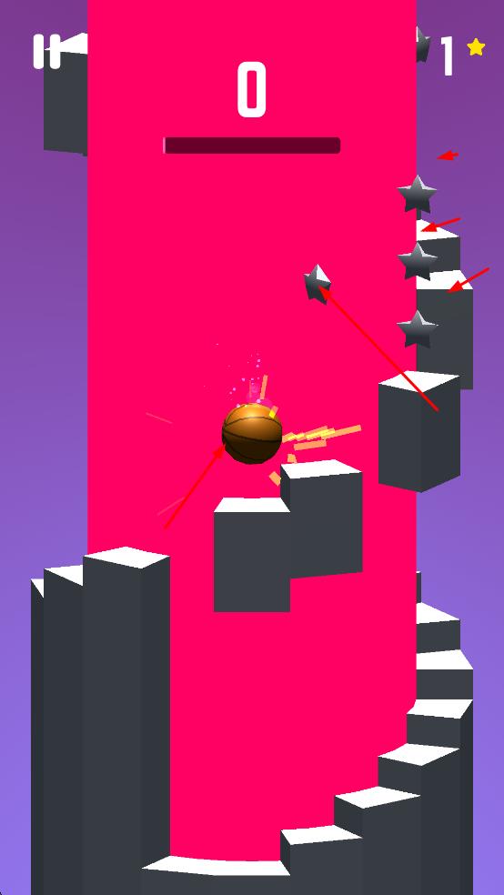 1、操控籃球在階梯地形滾動(dòng),躲避障礙,收集星星,積累右上角星數(shù)。