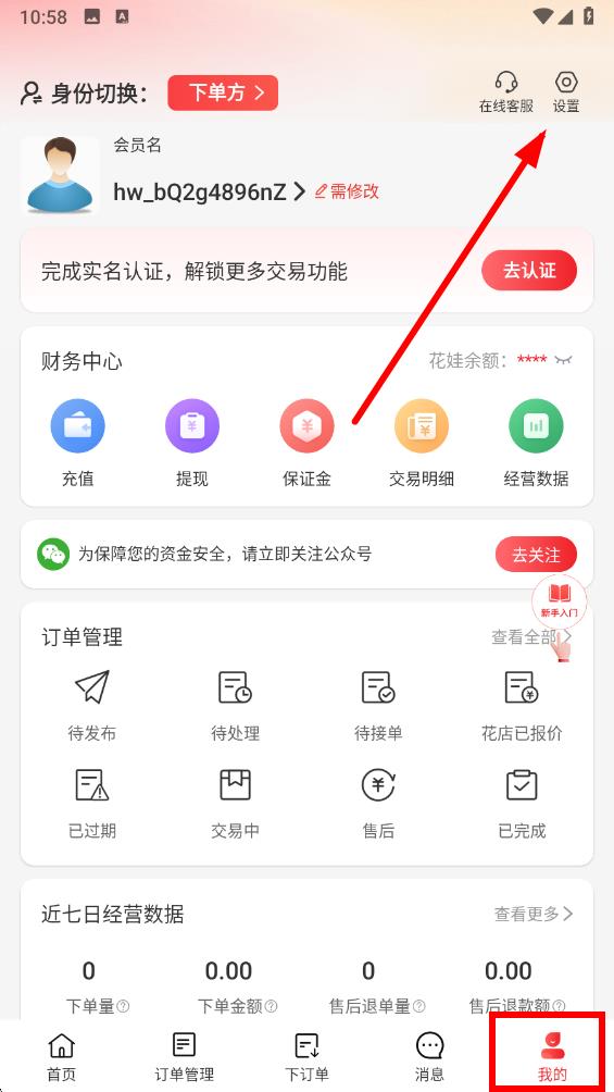 1、打開(kāi)花娃app點(diǎn)擊底部導(dǎo)航欄最右側(cè)我的選項(xiàng),進(jìn)入個(gè)人頁(yè)面點(diǎn)擊頁(yè)面右上角設(shè)置圖標(biāo)。