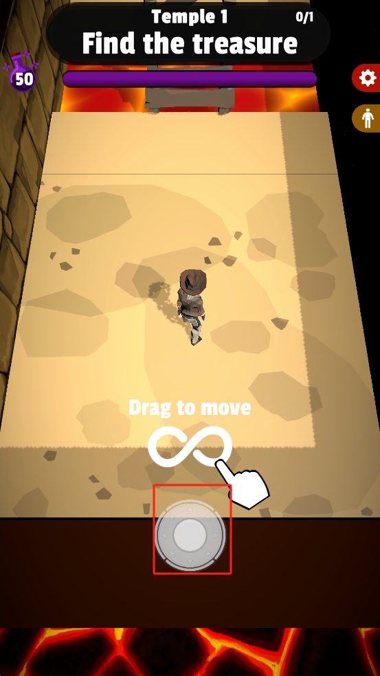 1、進入作品后,我們拖動紅框內(nèi)圓盤,控制角色移動,探索場景找寶藏,留意上方進度條,按提示操作前行。
