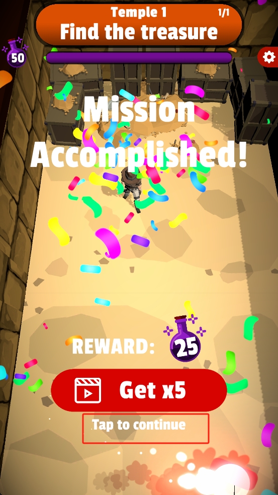 3、完成Temple1的尋寶,出現(xiàn)任務(wù)完成的界面,點擊紅框內(nèi)Tap to continue的按鈕,即可領(lǐng)取獎勵進入下一關(guān)。