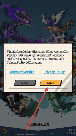 1、在Merge-2-Duck的服務(wù)條款彈窗中,點(diǎn)擊黃色Agree按鈕,同意Terms-of-Service與Privacy-Policy,進(jìn)入游戲主界面。