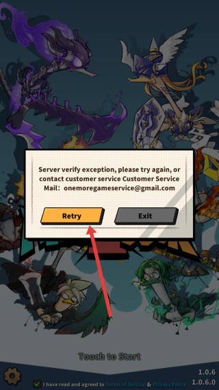 3、若出現(xiàn)服務(wù)器驗(yàn)證異常提示,點(diǎn)擊黃色Retry按鈕,重新嘗試連接服務(wù)器,繼續(xù)游戲進(jìn)程。