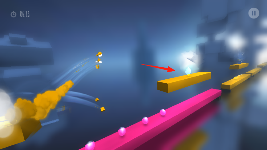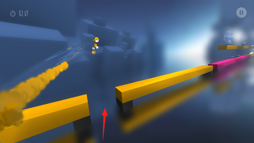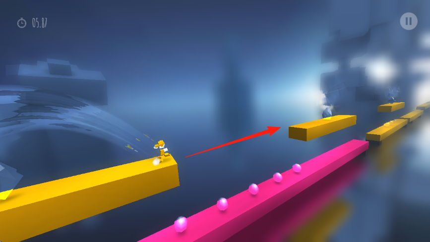 3、使小人從當(dāng)前黃色長板起跳,順著箭頭方向,躍過粉色長板區(qū)域,準(zhǔn)確落在帶有發(fā)光體的黃色長板上,保持跑酷節(jié)奏前進(jìn)。