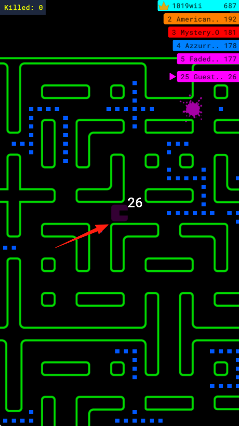 1、操控紫色色塊26,沿綠墻迷宮,吃藍色豆豆,避其他玩家,別被撞,積累分數(shù)。