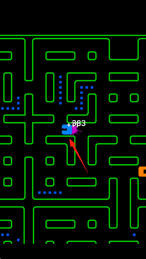 2、遇對手藍色+883,若體型大,撞它得分紫色飛濺體型小,躲,沿迷宮走,吃豆長大,靈活轉(zhuǎn)向。