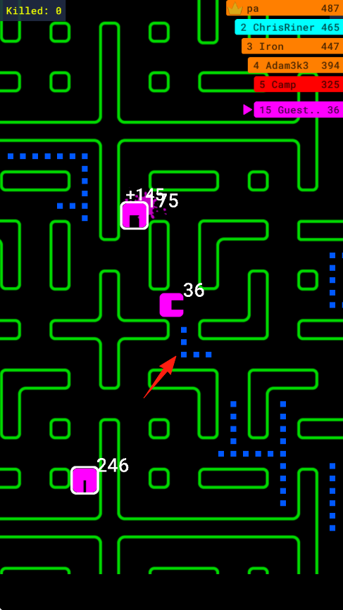 3、控粉色色塊,吃豆,遇對手,看體型,大則撞,小則躲,沿迷宮清豆,躲高分玩家,吃豆長大,撞敵加分。