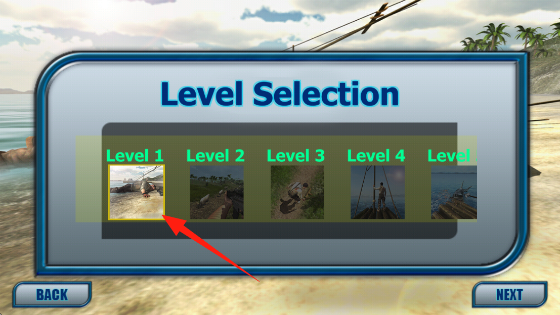 2、進(jìn)入Level-Selection界面,選擇Level-1關(guān)卡,開啟首場荒島生存挑戰(zhàn)任務(wù),點(diǎn)擊選擇關(guān)卡。