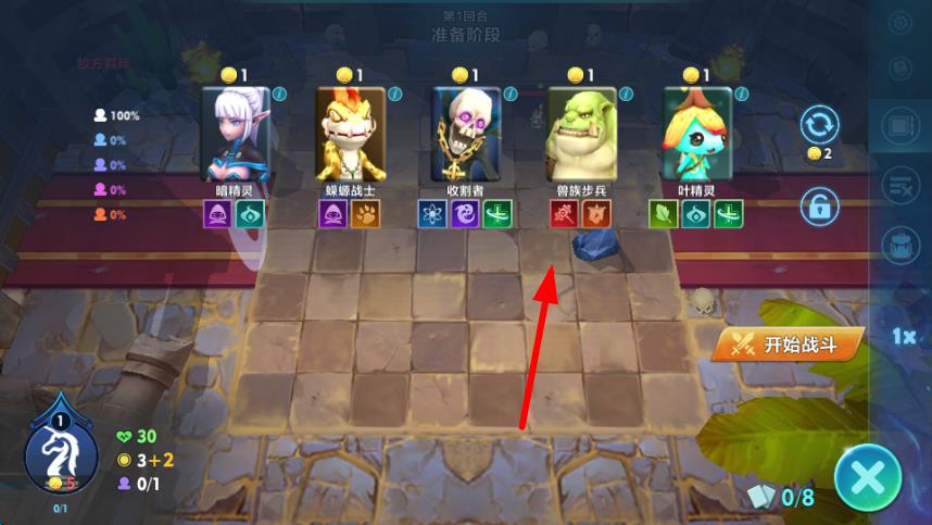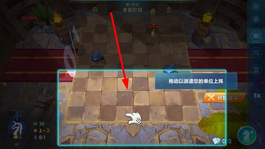 1、進入游戲后,在初始棋盤熟悉棋子招募、擺放規(guī)則,通過消耗基礎(chǔ)資源招募低階棋子,了解不同棋子的職業(yè)、種族特性與基礎(chǔ)技能,搭建初步陣容。