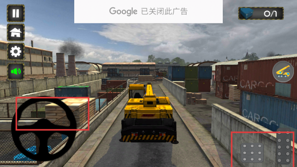 3、游戲中,左側(cè)方向盤控制吊車移動方向,右側(cè)按鍵操作機械臂,在工業(yè)區(qū)場景完成吊裝等任務(wù),注意廣告關(guān)閉后繼續(xù)推進。