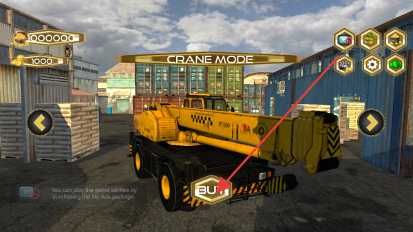 2、在CRANE MODE界面,點擊BUY箭頭指向,可購買相關(guān)內(nèi)容,或利用右上角功能鍵如設(shè)置、道具調(diào)整游戲。