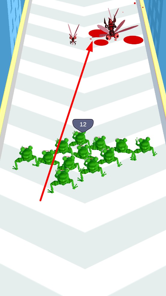1、開局操控青蛙群移動,吞噬賽道上的青蛙蛋,增加隊伍數(shù)量,避開蚊子的遠(yuǎn)程攻擊,瞄準(zhǔn)蚊子的位置,發(fā)起攻擊。
