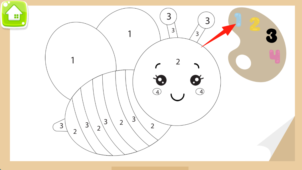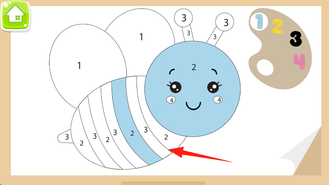 3、點(diǎn)擊圖案上標(biāo)有對應(yīng)數(shù)字的區(qū)域,進(jìn)行填色,完成蜜蜂圖案色彩填充,點(diǎn)擊涂色。