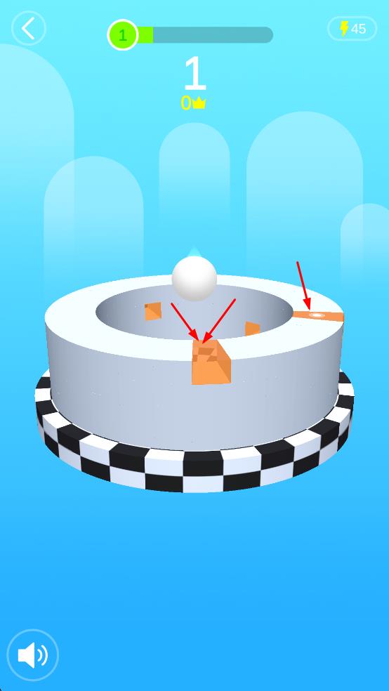 1、進(jìn)入關(guān)卡,滑動屏幕控制環(huán)形平臺旋轉(zhuǎn),調(diào)整白球滾動路徑,瞄準(zhǔn)橙色方塊收集。