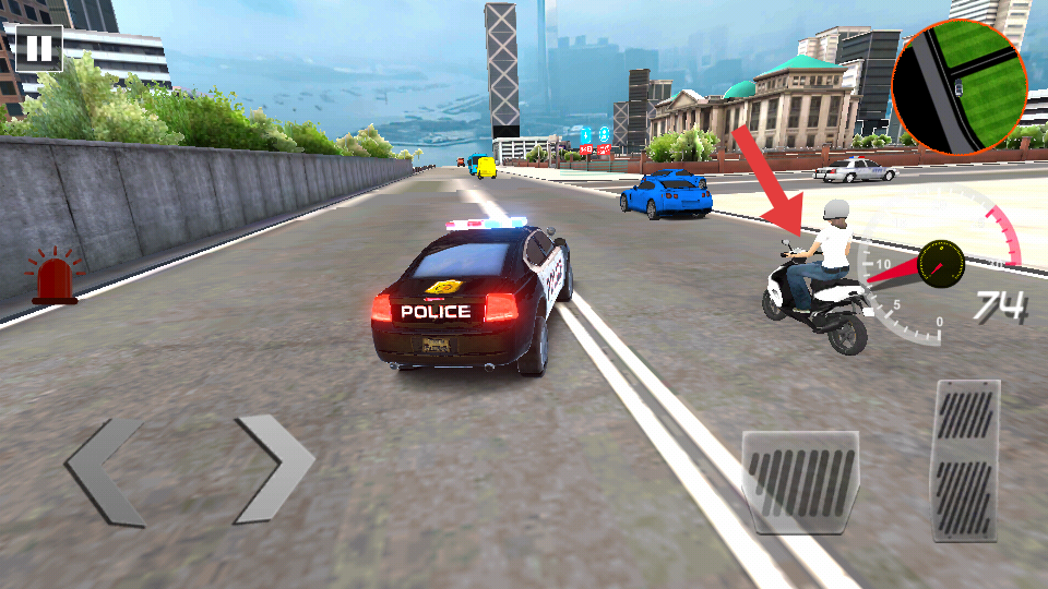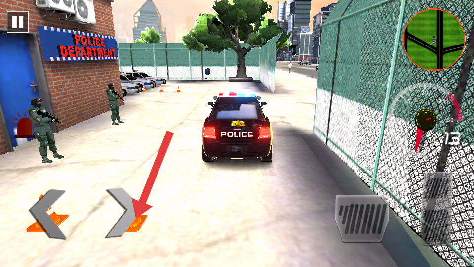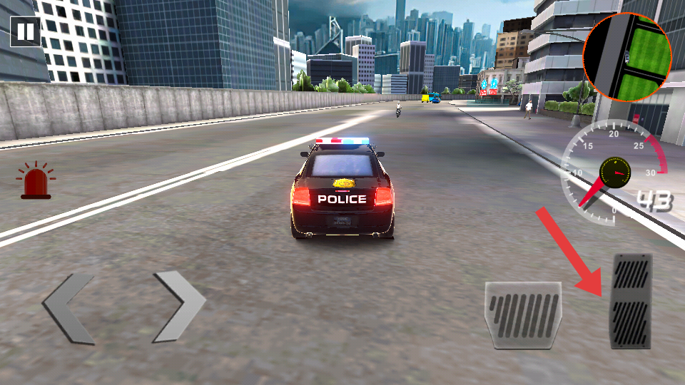 1、進入游戲,操控警車從警局的位置出發(fā),用左下角左右箭頭控制方向,右側(cè)踏板控制加速或者減速。