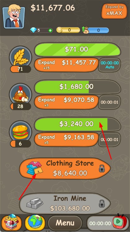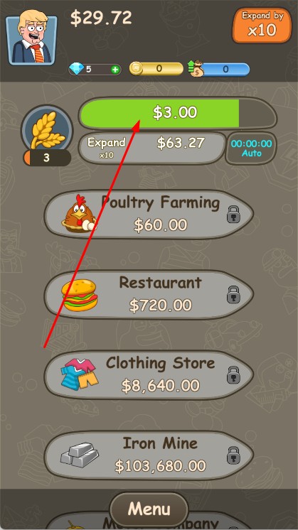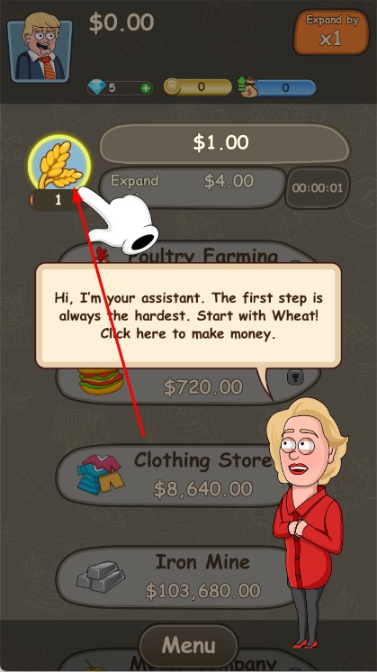 2、選擇業(yè)務(wù)類型,開發(fā)產(chǎn)品、拓展業(yè)務(wù),通過投資、收購擴大版圖,用金幣升級產(chǎn)業(yè)提升收益速度。