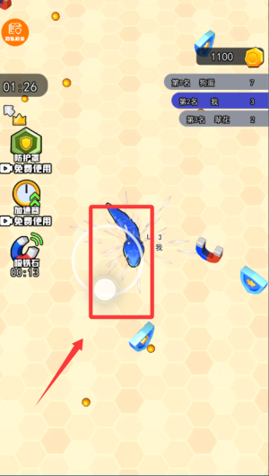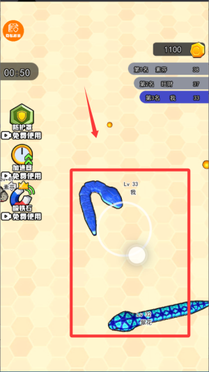 1、進入游戲后先控制蛇蛇移動,找機會繞到比自己小的對手身后,貼著它的身體走可以找機會吃掉它。