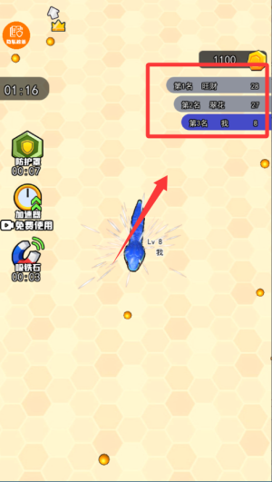 2、注意屏幕上的時間進度和排名,別一直待在安全區(qū),適時出擊吞噬小蛇才能快速提升自身體積。