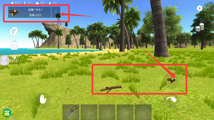 4、注意查看左上角任務(wù)目標(biāo),例如拾取特定數(shù)量的木材資源來完成當(dāng)前任務(wù)。