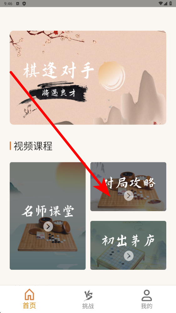 1、進(jìn)入找到課程區(qū)域,其中對(duì)局攻略板塊有豐富教學(xué)資源,點(diǎn)擊進(jìn)入可學(xué)習(xí)五子棋對(duì)戰(zhàn)技巧,了解不同局勢(shì)下的應(yīng)對(duì)策略,幫你快速提升棋藝基礎(chǔ)。