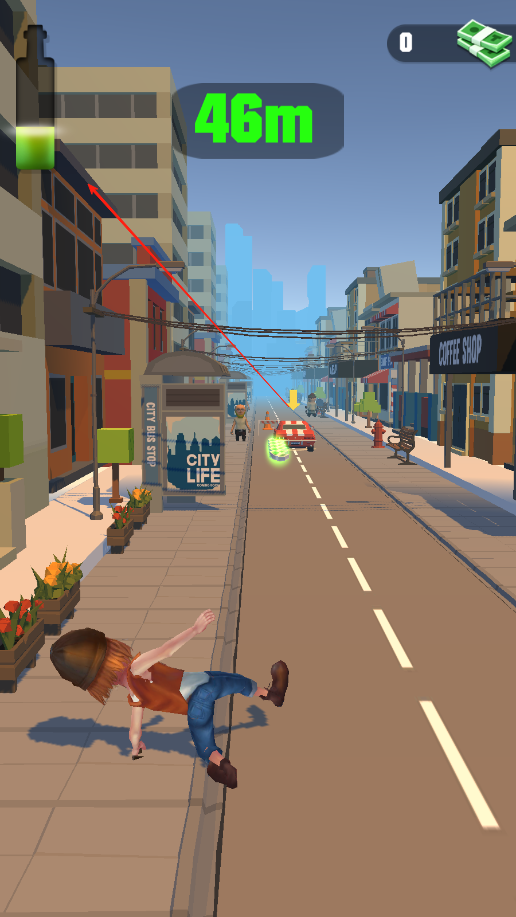 1、控制醉漢在街道奔跑,左右滑動(dòng)屏幕躲避路障、行人等障礙,撞上會(huì)減速或摔倒,保持移動(dòng)收集路上的鈔票。
