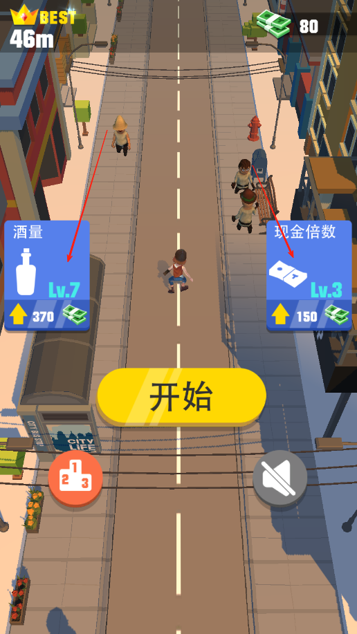 3、游戲結(jié)束后,用收集的鈔票升級(jí)酒量、現(xiàn)金倍數(shù)等屬性,提升后續(xù)奔跑中抗干擾能力和收益。