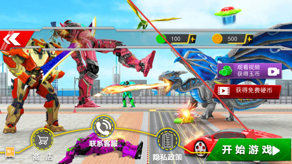 1、進(jìn)入游戲主界面,點(diǎn)擊右下角開始游戲,可先了解商店、客服等功能,再開啟機(jī)甲戰(zhàn)斗冒險(xiǎn)。
