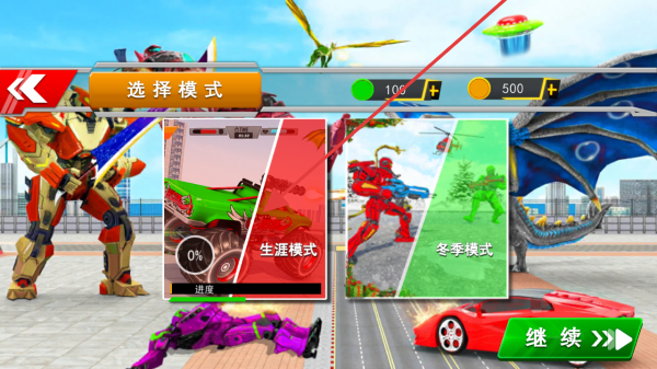 2、在模式選擇頁,可選生涯模式或冬季模式,選好后點(diǎn)繼續(xù),體驗(yàn)不同場景的機(jī)甲對戰(zhàn)玩法。