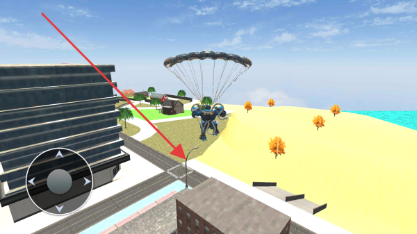3、游戲中操控機(jī)甲從高空跳傘,落地后利用左側(cè)搖桿移動,在城市、沙灘場景探索,完成戰(zhàn)斗或任務(wù)目標(biāo)。
