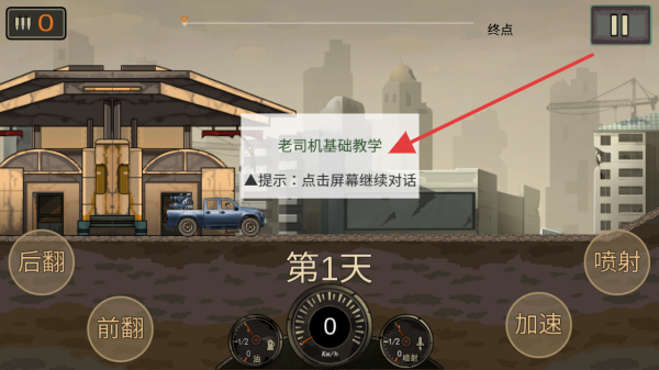 2、第1天關(guān)卡有老司機(jī)基礎(chǔ)教學(xué),點(diǎn)擊屏幕繼續(xù)對(duì)話,學(xué)習(xí)駕駛操作加速、翻轉(zhuǎn)等,掌握技巧應(yīng)對(duì)路況。