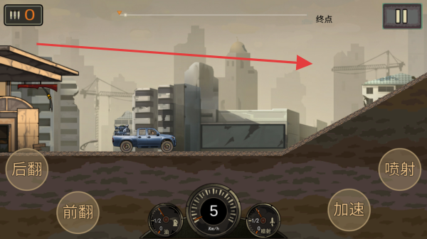 3、駕駛時(shí),用界面按鈕加速、噴射等操控卡車,按箭頭指引朝終點(diǎn)行駛,跨越地形障礙,完成關(guān)卡目標(biāo)。