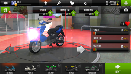 2、車庫系統(tǒng)提供多款性能各異的摩托車選擇,每輛機(jī)車均可查看詳細(xì)參數(shù)與改裝選項(xiàng)。