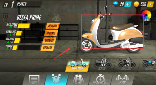 3、車庫系統(tǒng)收錄多款性能各異的機(jī)車,每輛均可查看詳細(xì)參數(shù)與改裝選項。