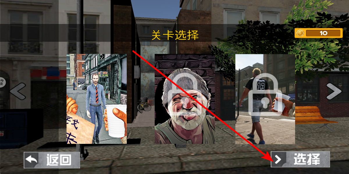 1、進(jìn)入游戲界面后,畫面呈現(xiàn)流浪漢初始場景,點(diǎn)擊右側(cè)顯眼開始游戲按鈕,正式開啟流浪漢專屬的生存模擬之旅,無縫銜接后續(xù)關(guān)卡選擇與城市求生等核心環(huán)節(jié)。